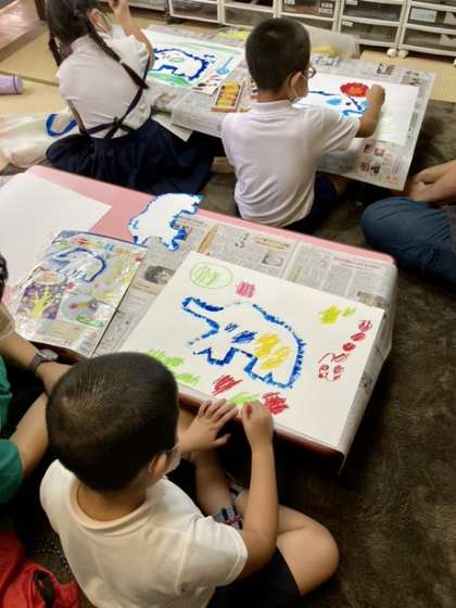 型を抜いて絵の具をつけてポンポンと楽しんでいました。その後はパスで仲間を増やしたり、星や草を描いたりしていました。