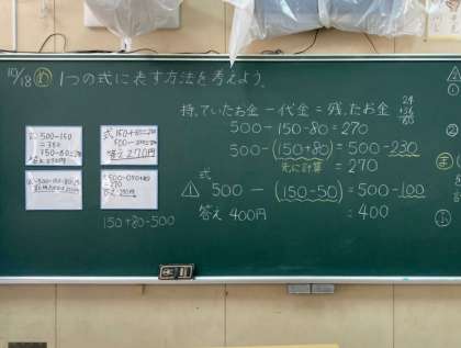 算数科では、これまでに学習したことをもとに一つの式に表す方法を考えていく学習をしています。