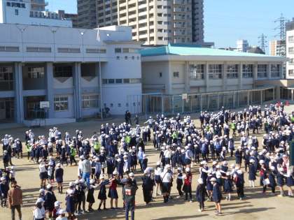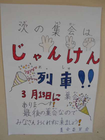 今年度最後の集会活動は、「じゃんけん列車」。列が長くなるたびに、じゃんけんで勝敗がついたあとの声もどんどん大きくなっていきました。