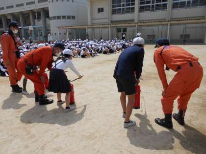 避難した後に、消火器は、「ピンポンパン」の合図で使うことを教えていただき、学年の代表の児童が、水消火器を体験しました。