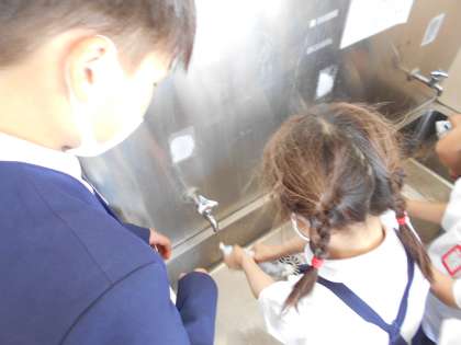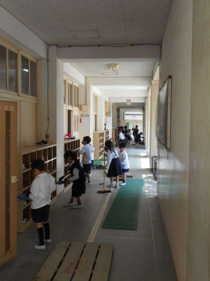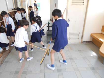 今日は1年生が初めての清掃活動に取り組みました。6年生が清掃道具の使い方やゴミの集め方などについて1年生にやさしく教えてくれました。「ぞうきんは、水が出ないまでぎゅっとしぼるんだよ。」「ちりとりをこの角度にするとゴミを集めやすいよ。」と教えてもらい、さっそく挑戦する素直な1年生。