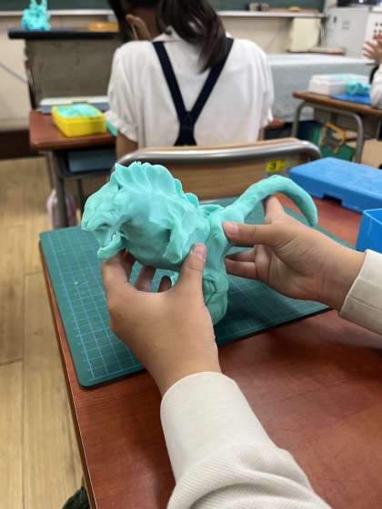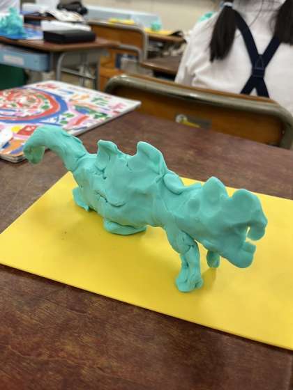 2年生は、図画工作の学習で粘土をしています。1つの大きな粘土の塊から、ひねり出したり、つまんだり穴をあけたりして生き物を作ります。一人一人、自分が作りたい生き物を想像しながら、楽しそうに作っています。どんな生き物が生まれるのか楽しみです。