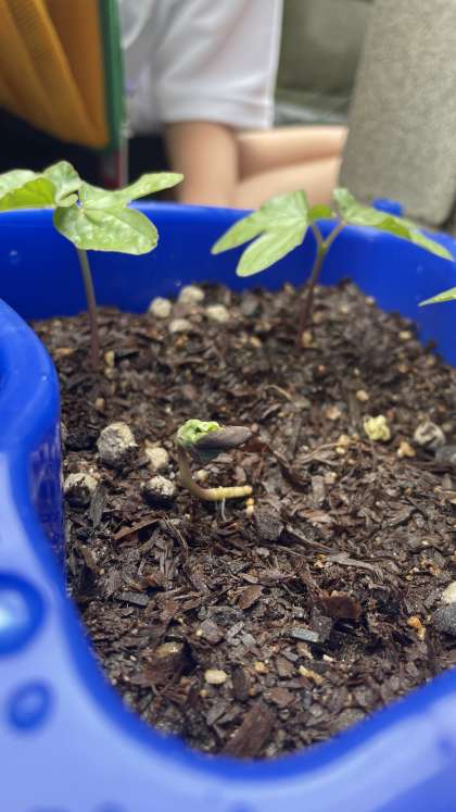 子どもたちが種まきをした植木鉢から、次々とあさがおの芽が出てきました。