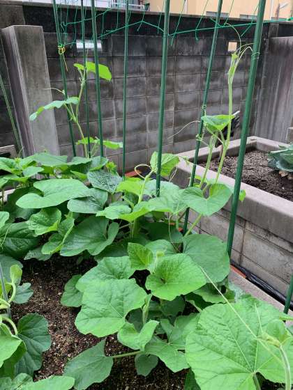 最近は、茎がしっかりとしてきて立派な葉が青々と、また、つるが伸びてきていきいきと成長しています。