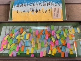 正門の玄関を入ってすぐの掲示板には、月替わりの内容を掲示しています。今月の掲示は4年生です。