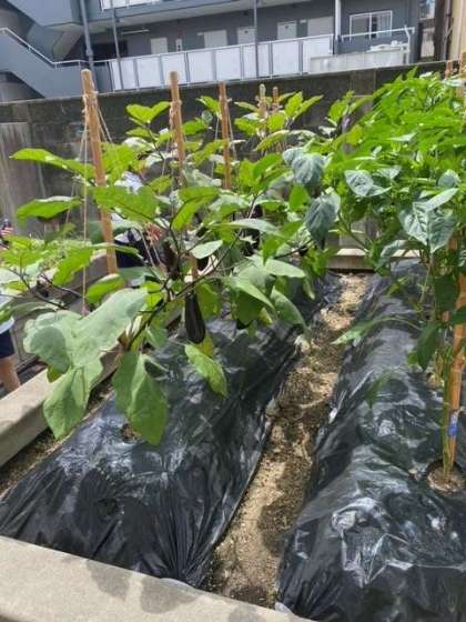 学習園で育てているナスとピーマンの収穫を行いました。大きく実をつけている様子に子どもたちも大喜びでした。