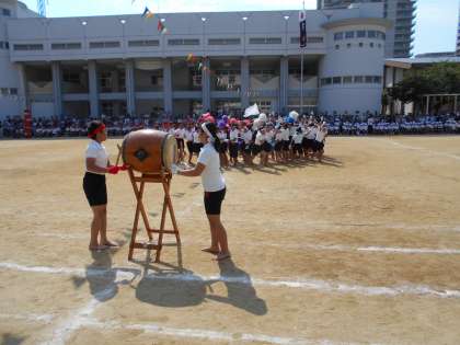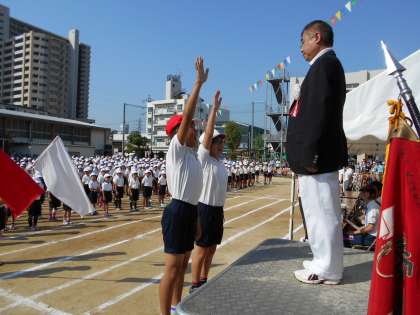 児童代表の選手宣誓から、「赤勝て!、白勝て!」の運動会が