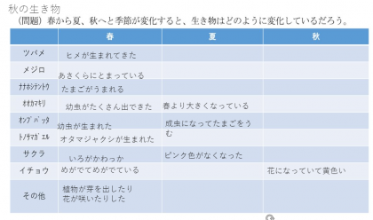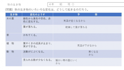 季節のうつり変わりと、秋の生き物のようすが変化する理由を予想し、グループで表にまとめていきます。