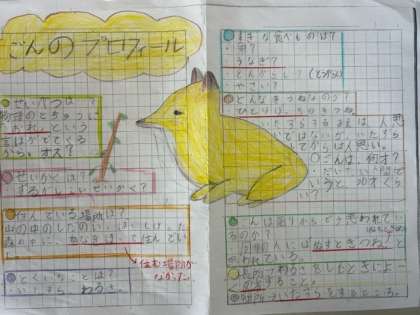 ごんのプロフィールシートを作ったり、場面ごとの小タイトルをつけたりしながら、興味をもって主体的に学習できるように工夫しています。