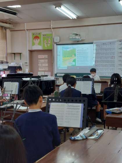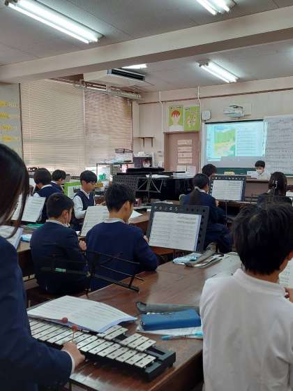 教科書の編曲では、サビの難しい部分はカットされていますが、原曲を聴いた子どもたちから「サビの部分も演奏したい!」という声が上がり、難しいバージョンの楽譜で演奏しています。