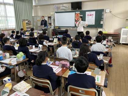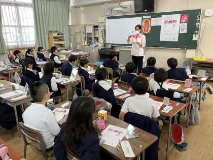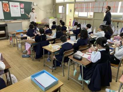 2年生は歯磨き指導がありました。虫歯になる原因を知り、虫歯にならないためにはきちんと歯を磨くことを学習しました。歯垢が赤く染まるもので歯を1本だけ赤く染めてもらい、どんな風に染まっているかを確認しました。その後、鏡を見ながら歯ブラシで真っ白になるようにきれいに磨いていました。