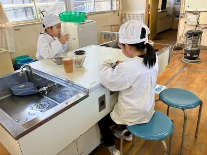 初めての家庭科室や調理実習に緊張している様子もありましたが、お茶の葉をはかったり、お湯を沸かしたりして、グループで協力してお茶を淹れることができました。