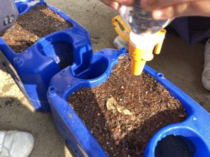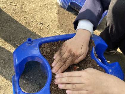 春から夏にかけて、立派なアサガオを育て上げた1年生。次は、春に向けてチューリップの球根を植えました。