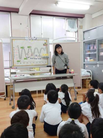 保健指導のテーマは「すいみん」についてです。睡眠中は、眠りが浅くなったり深くなったりしながら体や心を回復したり、学校での勉強を覚えたりしていることを学びました。