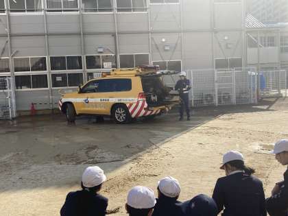 黄色のパトロールカー(黄パト)を実際に見せていただき、パトロール隊の仕事を実演してもらいました。黄パトのサイレンを鳴らしてもらったり、質問に答えてもらったりして、楽しく学習することができました。