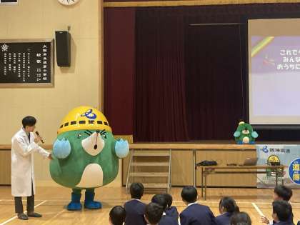 22日(月)、「道路博士の出前講座」で阪神高速道路の方や朝日新聞の方に来ていただき、高速道路の役割やパトロール隊の仕事、渋滞の仕組みなどを教えていただきました。