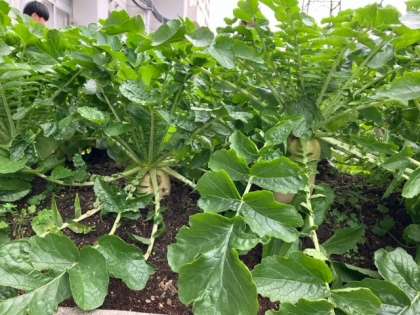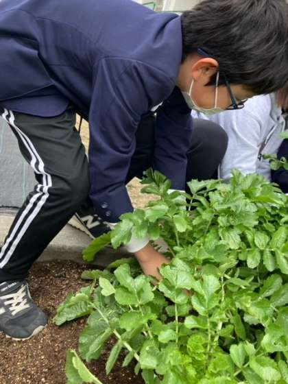 土の上にたくさん茂った大根の葉を見て、土の下にどんな大根ができているのかワクワクする子どもたち。
