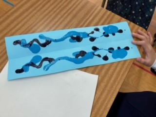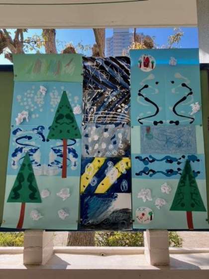 なかよし学級会で、2月の掲示を制作しました。絵本「ゆきのひ」の読み聞かせを聞いた後、雪の世界を想像しながら思い思いにデカルコマニーや絵を楽しみました。