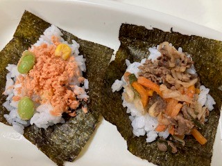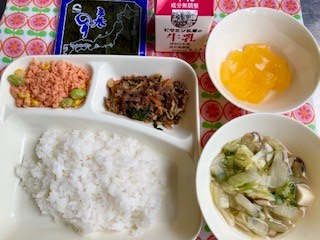 今年の卒業祝い献立は「手巻きご飯(具:牛肉のコチジャンいため・さけのカラフルそぼろ)すまし汁・ダイスゼリー(みかん)・牛乳」でした。牛肉のコチジャンいためには、切干しだいこんを加え、栄養素と歯ごたえをプラスしています。