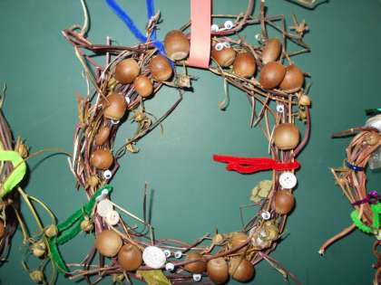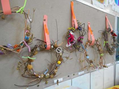 1年生は育てていたアサガオのつるをくるくる輪にしてリースを作り