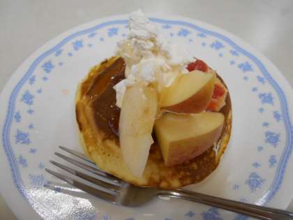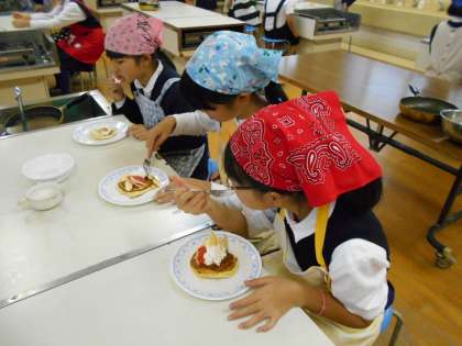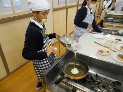 料理クラブでは、フルーツパンケーキを作りました。