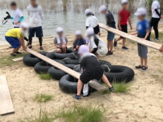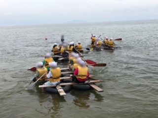自動車のタイヤ、木材、ロープを使って自分たちでいかだを作ります。