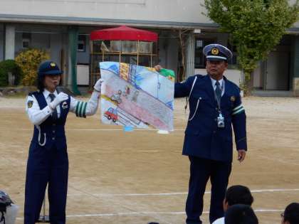 先日、1年・3年・5年生は運動場で交通安全指導を行いました。