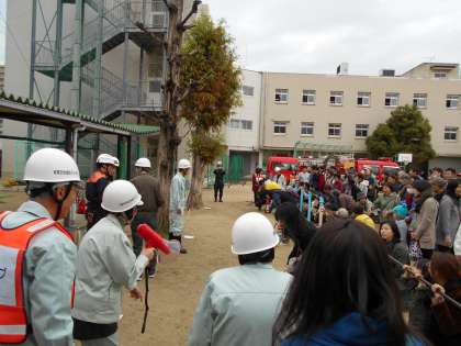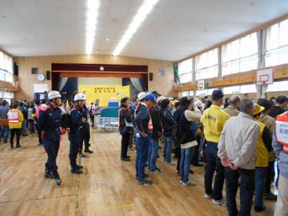 講堂と運動場では、地域とPTAの皆さんが訓練中!