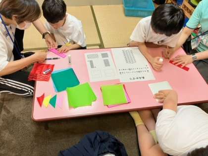 最後は、笹の葉の飾りを作りました。「あみかざり」「ちょうちん」「さんかくつなぎ」の中から好きな飾りを1つ選んで作りました。