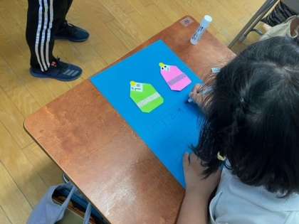 7月のカレンダーも作りました。折り紙で織姫と彦星を折りました。同じ折り方でも、折り幅の違いや描いた表情によって、みんな違う可愛らしい織姫と彦星が完成しました。