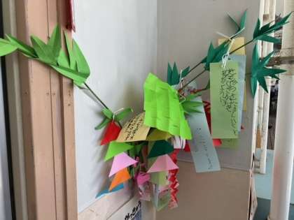 七夕にちなんだ絵本のお話を聞いた後、短冊に願い事を書きました。