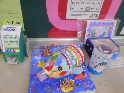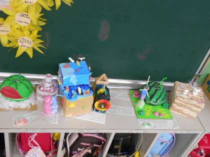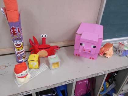 教室をのぞいてみると、ロッカーの上には、夏休みにがんばって作った貯金箱や自由研究が並んでいました。