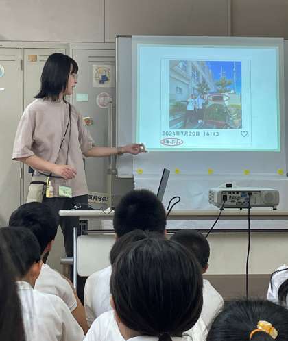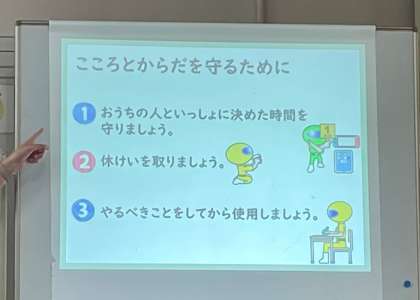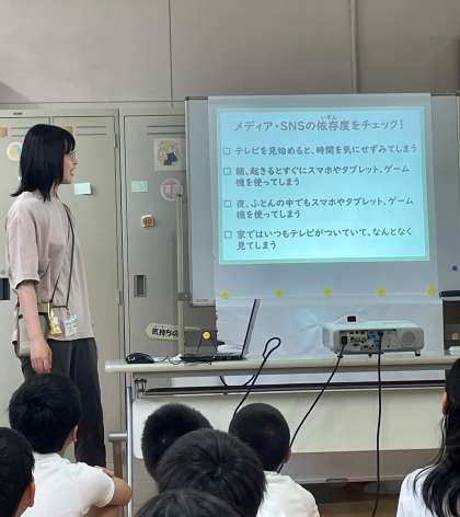 保健指導のテーマは「メディアとのつきあい方」についてです。メディア・SNSが心身に与える影響やSNSに投稿する際に気を付けること、フェイクニュースなどについて学びました。何気なく撮った写真でも、個人情報が含まれていると知って、驚く子どもたちもいました。