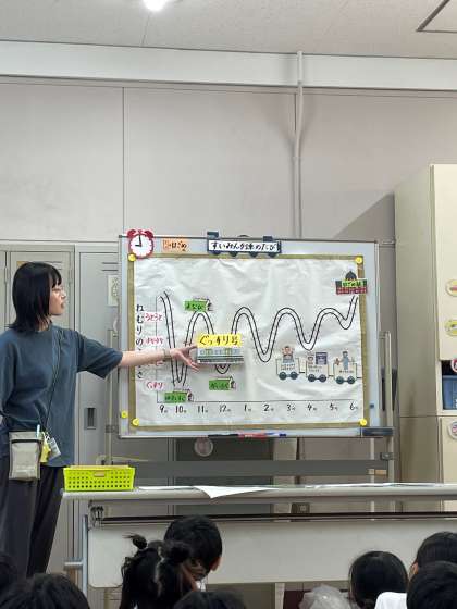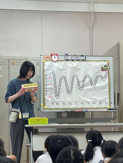 小学生に必要な睡眠時間は9〜12時間といわれています。ぐっすり号と特急ねぶそく号に乗って、眠っている間に体の中で起こっていることをすいみん列車の旅に出て学びました。