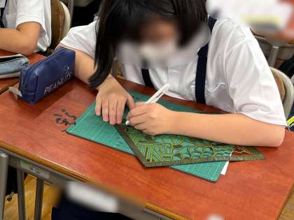 カッターナイフの扱いに気をつけながら、自分で描いたデザインの細部まで丁寧に切り取っていきます。「ここをもっと工夫したい。」「めっちゃ疲れるけど、楽しい!」などと話しながら、素晴らしい集中力を発揮し着実に進めることができました。