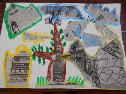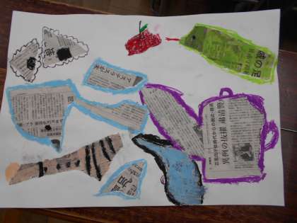 新聞紙をちぎって、画用紙に貼り、いろんな方向からその形を見て、何かの形に見立ててクレパスで描きました。