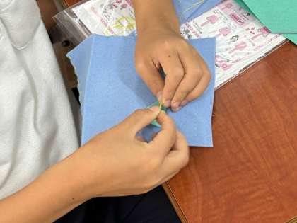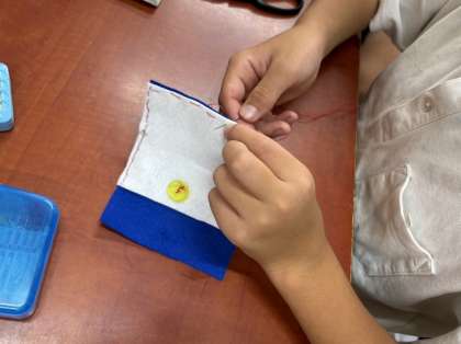5年生は今、家庭科の時間に学習した手縫いの方法を生かして小物づくりをしています。