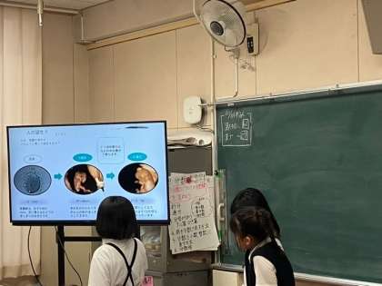 ヒトの子どもは母親の体内でどのように育って誕生するのかを班ごとに調べ、パワーポイントにまとめて発表しました。