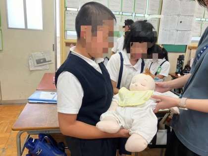 発表後には、生まれたばかりの赤ちゃんの教材を一人一人抱っこしました。「重〜い。弟もこれくらいの重さやったー。これはお母さんたいへんやなー。」と学習を通して、母親の苦労や命の重みなど、実感を伴って学ぶことができました。