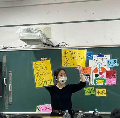 様々なクイズや実験を通して、たばこやアルコールが体に及ぼす影響や、薬の正しい飲み方、使用してはいけない薬物などについて学習しました。子どもたちも真剣に話を聞いていました。
