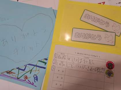 ありがとうチケットは、「ありがとうチケットつうちょう」にお手伝いしたことを書いて、つうちょうに入れました。ありがとうチケットは、何枚かためておこづかいと交換しました。