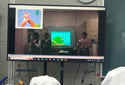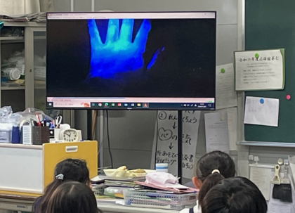 保健委員会の児童が朝会で呼びかけを行いました。また、給食時間に手洗いのクイズや実験をしたり、正しい手の洗い方を動画で伝えたりしました。