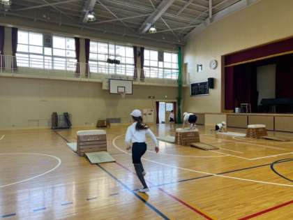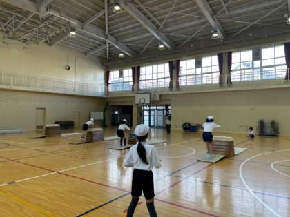 開脚跳び・かかえこみ跳び・台上前転を練習しています。手のつく位置やお尻の高さなどのポイントを意識して、全員が一生懸命練習しています。