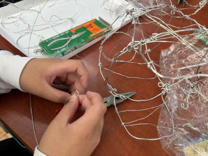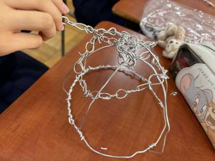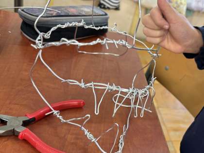 針金の性質やラジオペンチの使い方を知り、「友だちが驚くような冠を作ろう!」と楽しみながら製作しています。