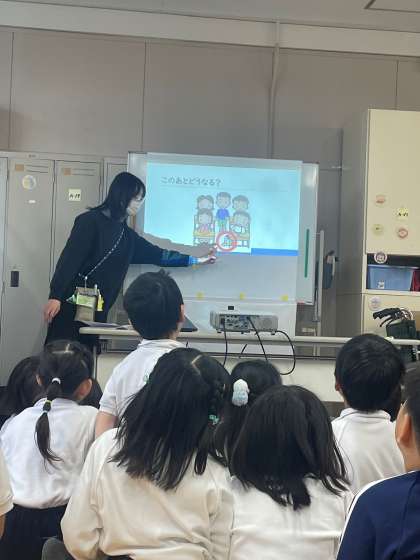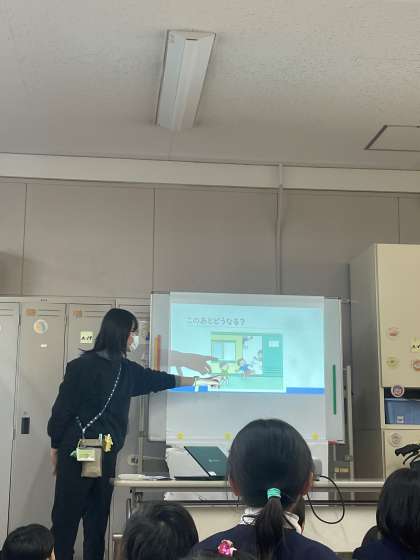 保健指導のテーマは「けがをふせごう」です。イラストを見て、どこが危ないか、どうしたらけがを防ぐことができたかを考えました。