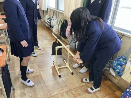 子どもたちは、「けっこう 重い!」「この位置で棒を押さえたほうが手ごたえが小さい!」と、違いを体感できていました。