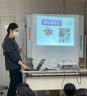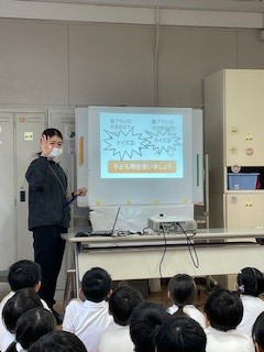 保健指導のテーマは「歯みがき」です。「おじいさんの宝物」という絵本を読んだ後、歯みがきや歯に対するクイズを出しました。