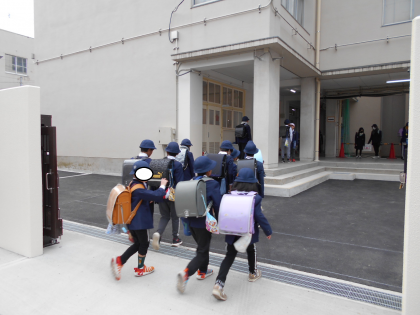 寒さに負けず、子どもたちは元気に新しい正門から登校しました。