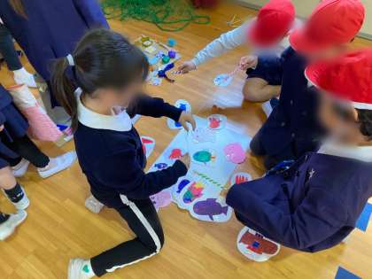 各クラス6つのグループに分かれて、1年生に楽しんでもらえるような魚釣りや紙コップロケットなどの遊びを企画しました。