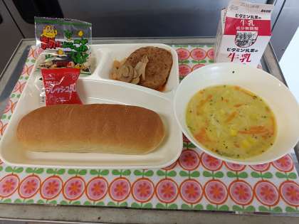 今日の給食は、「コッペパン」「いちごジャム」「牛乳」「煮込みハンバーグ」「コーンスープ」「豆昆布」です。